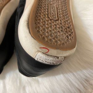 Luxury Sneakers, Classic Coach Fabric, black , no size tag, measure with rule see pics please , worn and shows some signs of wear, see pic, rip on both shoes, but still has some life, comfortable and good for wide feet, My daugther is and 8 and it fits her, will fit a 8