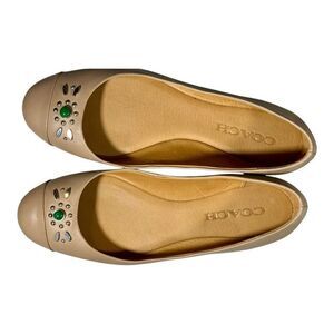 Adorable Coach beige flats have leather upper with silver colored metal and green stone detail. Slip on with leather lining. Lightly padded footbed. Leather and synthetic outsole.
