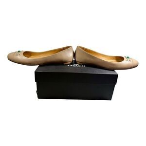 Adorable Coach beige flats have leather upper with silver colored metal and green stone detail. Slip on with leather lining. Lightly padded footbed. Leather and synthetic outsole.