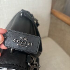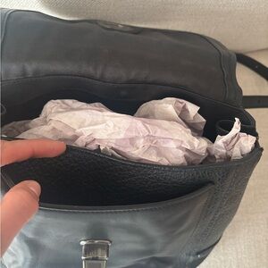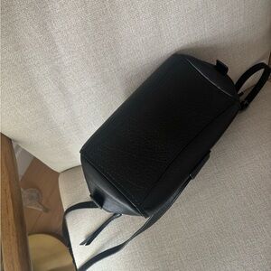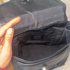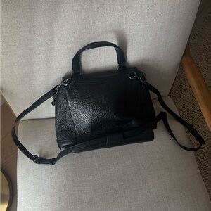 Stylish black leather handbag with a top handle and detachable shoulder strap. Secure turn-lock closure and front pocket for easy access. Clean, versatile design that complements any outfit. Comfortable to carry as a crossbody or by hand. Gently used.