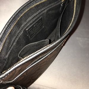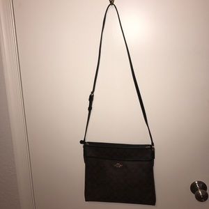 Signature coated canvas. Inside zip, cell phone and multifunction pockets. Zip top closure, fabric lining. Long strap with 21 1/2 inch drop for shoulder or Crossbody wear. Measurements are 11 3/4" L x 10 1/4" H x 2" W. This item is practically new, was only used once.
