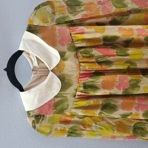 Charming floral dress with a Peter Pan collar. Features a mix of pink, green, and yellow hues. Perfect for a stylish look.