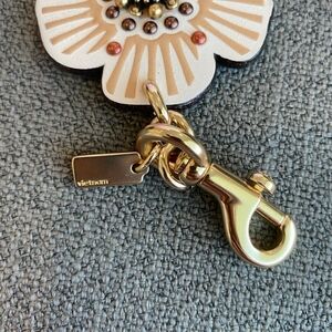 Elevate your accessory game with this elegant Coach floral keychain. Featuring a beautiful cream flower design accented with gold hardware, it's perfect for adding a touch of luxury to your keys or bag.