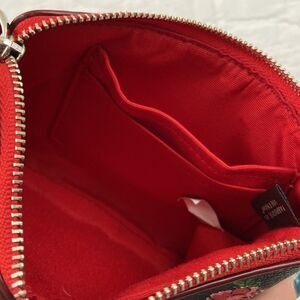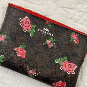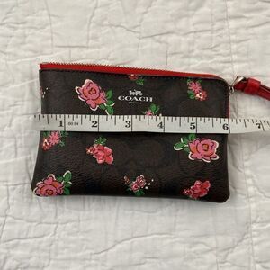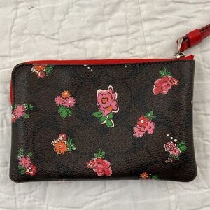 This Coach wristlet features a charming floral design on a brown background with vibrant red accents. Perfect for adding a touch of elegance to your outfit.