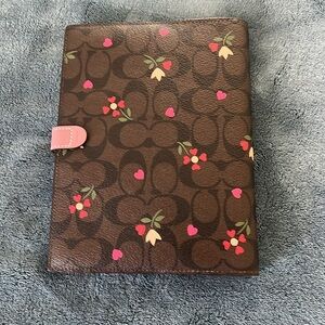 Planner is not new, but in good shape. A sticker was placed on the back bottom right the area is a little shinny but not noticeable. The first hard page of the notebook was taken out, however all the other sheets remain the back hardcover is a little wrinkled.