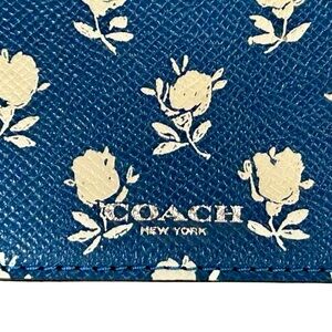 Add a touch of charm to your everyday essentials with this authentic Coach wristlet pouch featuring a mini white rosebud floral print on a rich cobalt blue crossgrain leather. Sleek and slim with a secure zip closure, it’s the perfect grab-and-go piece for keys, cards, or cosmetics.