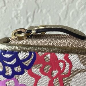 Stylish Coach wallet with vibrant floral design. Features a zip closure.