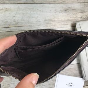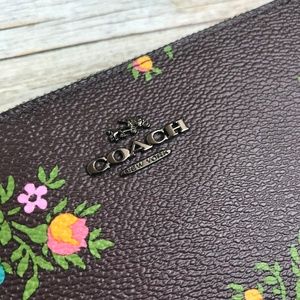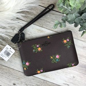 Coach Floral Wristlet Dk/Oxblood Cross Stitch Floral (DKMXP) This has never been used. Comes with tag still attached. Please refer to photos for more details. Details: - Approximately 7.5"W x 4.5"H - Inside includes 2 card slots. - Care Instructions included - Floral printed coated canvas.