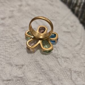 Charming flower ring with blue, pink, and green stones. Gold-tone setting adds elegance.