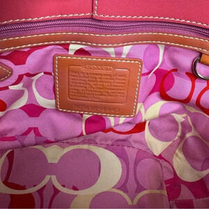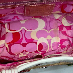 This vintage COACH bag features a beautiful floral pattern on a beige straw exterior, making it a lovely addition to any outfit. With its bucket bag style and limited edition status, it's a rare find for any collector. The bag is made of high-quality materials and has been well-cared for, ensuring its longevity and durability. Its vintage status adds to its charm and uniqueness. Perfect for any woman who wants to make a statement with her fashion choices, this rare and limited edition COACH bag is a must-have for any wardrobe.