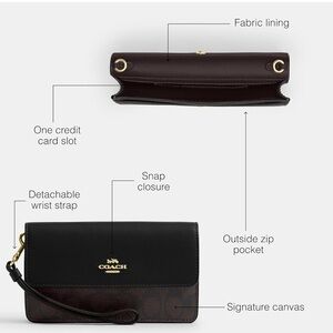 Elegant Coach wristlet with signature pattern in color walnut/black. Features black leather and brown accents. Includes a convenient wrist strap that can be removed. It has slot for cards, in the front it snaps/buttons closed, and then the back has a zip up coin holder. Only used a few times, excellent condition!!