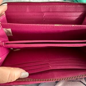 Vibrant fuchsia leather zipper wallet by Coach. Sleek and stylish design. Perfect for adding a bold touch to any outfit.
