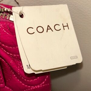 Vibrant fuchsia Coach wristlet. Sleek design with signature pattern. Perfect for adding a pop of color.