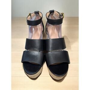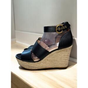 These Coach G4975 Isla Wedge Sandals in Size 11B are the perfect wedge to add to your wardrobe! Featuring black leather uppers with braided raffia wedge heels and a brass C buckle closure, these wedges are an elevated take on a classic design. If you love and appreciate Coach style and quality, you need these in your collection!