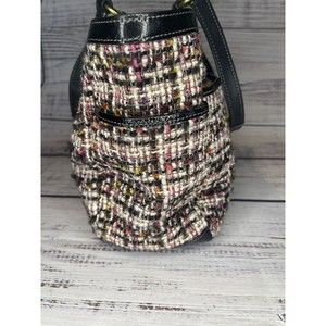 This Coach Galaxy Tweed Tote Bag is a stylish and versatile accessory for women. It has a unique pattern of black, pink, and tan colors that make it stand out in any crowd. The bag is made with high-quality tweed material that is both durable and stylish.