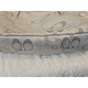 The Coach Gallery Optic Silver Metallic Signature Tote Shoulder Handbag is a large oval-shaped bag made of silver canvas with a metallic finish. It features a zip closure, double silver handles, and silver hardware. The bag is lined with pink fabric and includes inner and outer pockets, an adjustable strap, and is part of the limited edition Coach City Tote collection. This stylish satchel/top handle bag is perfect for travel, casual, or business occasions, making it a versatile and chic accessory for women looking to make a statement with their fashion. Needs to be washed.