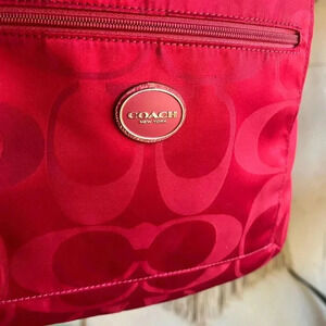 Coach Getaway bag, signature nylon crossbody, pink Coach shoulder bag, getaway travel purse, lightweight logo bag, adjustable Coach crossbody, everyday nylon handbag.