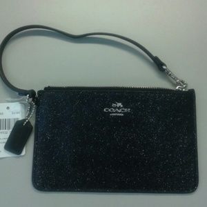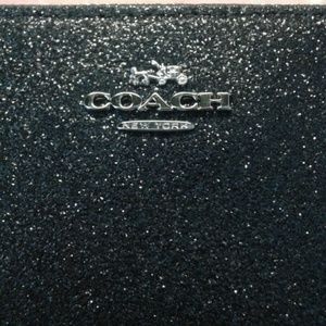 Glittery Coach Charcoal Grey Wristlet. Crafted in sparkling gunmetal silver glitter, this thoughtfully designed wristlet is large enough for a phone, cash, cards and other essentials. A dogleash clip on the strap and an embossed hangtag charm finish it with iconic signature style. Interior has slots for credit cards. Top zip with silver accents/hardware. Measures Perfect for dinner or girls night out!!!