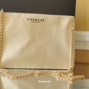 Chic Coach wristlet in shimmering gold. Features elegant chain strap. Ideal for evening outings.