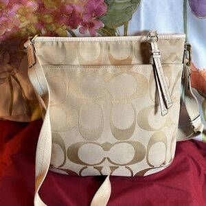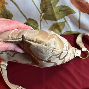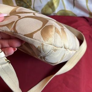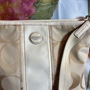 #457. Has signature C logo throughout. Outside slip pocket on back. Pink lining inside with zip pocket and two slip pockets very clean inside. Outside has some wear and on canvas and rubbing on front center piece. See photos.