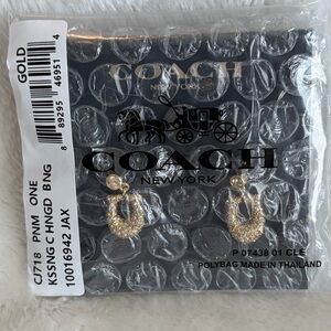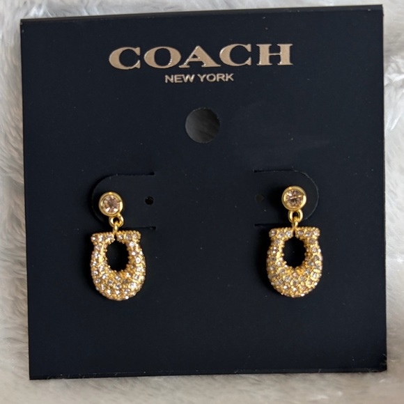 Beautiful Coach New York gold-tone drop earrings featuring the iconic Coach “C” logo fully encrusted with sparkling pavé crystals.