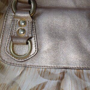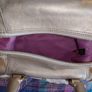 Gold leather handles and convertible shoulder strap with gold hardware and top zipper closure