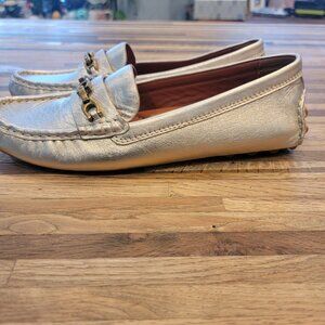Chic gold leather loafers. Features a stylish chain accent. Perfect for casual elegance.