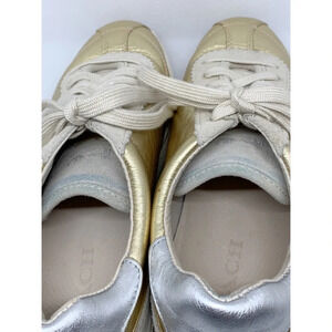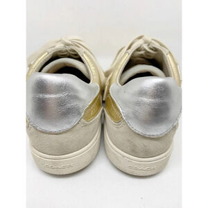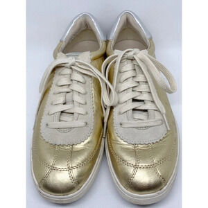 Coach Gold Metallic Lace Up Sneaker 9. Minor signs of wear. Tops of tongue showing some color transfer. Gold laces also included. Retail $295