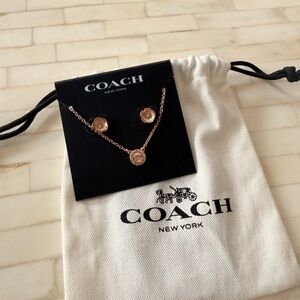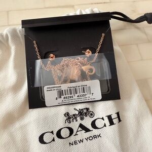 This stunning Coach necklace features a delicate pendant with beautiful matching floral earrings in a radiant gold finish. Its elegant design is enhanced by sparkling accents, making it a perfect accessory for any occasion. The necklace's refined aesthetic adds a touch of sophistication to any ensemble.