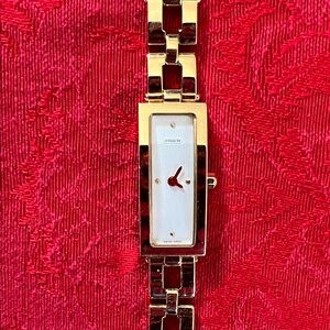 Stylish Coach watch with a gold band. Rectangular face with minimalist design.