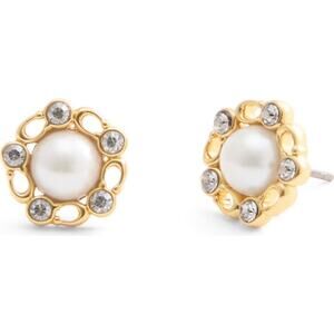 Coach Gold Tone Faux Pearl Rhinestone Stud Earrings Classic Floral Halo