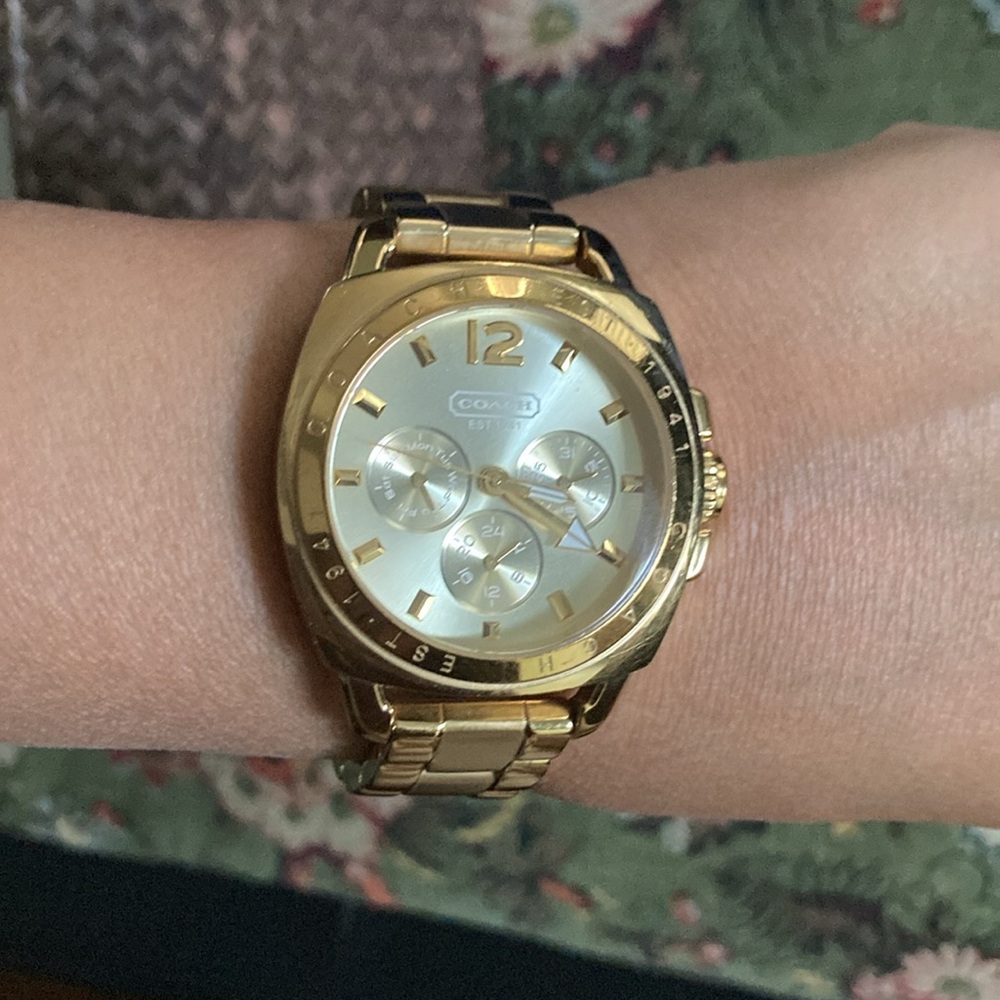 Coach gold watch. Used but in excellent condition. NEEDS BATTERY. 2 small marks on gold band (see last photo)