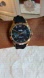 Elegant Coach watch with a gold-tone bezel and black strap. Features a black dial with gold accents.