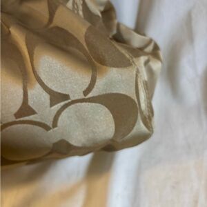 Chic Coach bag with signature pattern. Gold and brown tones. Stylish and versatile for any outfit.