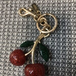 Charming Coach key holder with cherry design. Features gold hardware and red cherries. Perfect accessory for keys or bags.