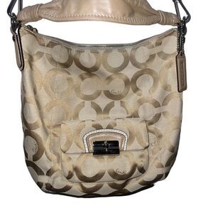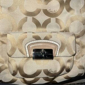 Authentic Coach Monogram C Gold Canvas shoulder bag with hand strap or shorter strap as well. Longer shoulder strap seen is removable. Never used. New condition. See photos. Large 13” X 12 1/2”.