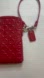 Coach Gramercy wristlet / small pouch in red patent leather with embossed “C” pattern. Zip top closure, detachable strap, compact but roomy enough for essentials (cards, phone, keys).