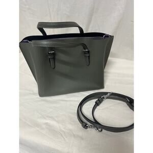 Elegant gray crossbody bag. Features top handles and detachable strap. Sleek and versatile design.