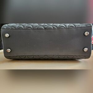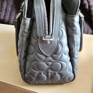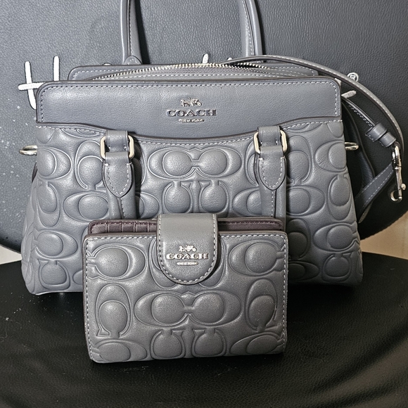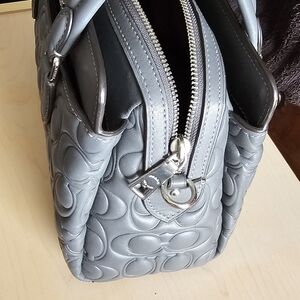 Coach satchel and matching wallet in embossed leather. Iconic Coach pattern with silver-tone logo hardware. Top handles and detachable shoulder strap for carry options. Compact wallet with snap closure for cards and cash. Sophisticated gray color that pairs with many looks.