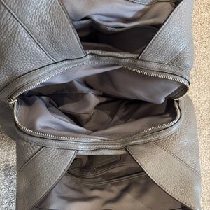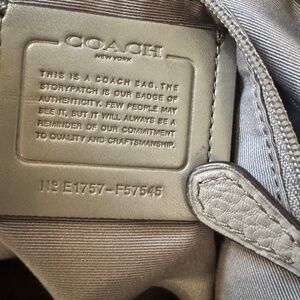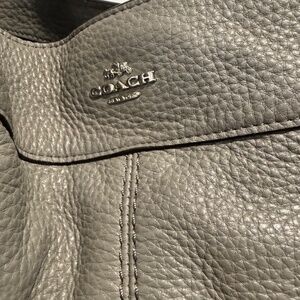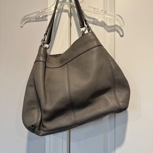Genuine Coach leather shoulder bag feature chrome hardware. Bag has three pockets and measures about 11”x11”x4”