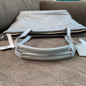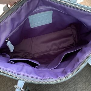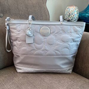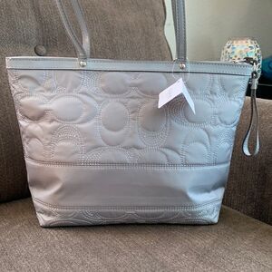 Elegant Coach tote with quilted design. Features a sleek gray finish. Includes Coach tag and logo detail.