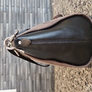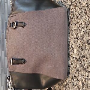 Stylish Coach crossbody bag. Features gray fabric with black accents. Perfect for everyday use.