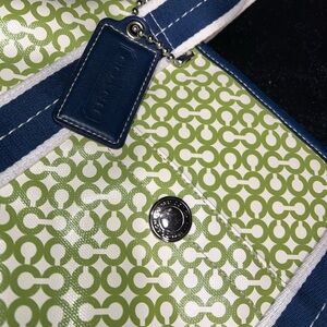 Stylish Coach tote with green pattern. Blue vertical stripes. Perfect for everyday use.