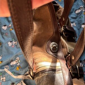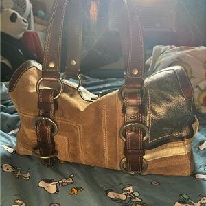 Green with silver coach bag rare. So super beautiful the green parts are suede and the turn-lock closure is so unique. The inside has two pockets and one zipper pocket. Style number 10151 some scratches and what looks like some blue pen on the silver leather check pictures please. very open to offers!