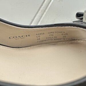 Coach Gretchen 5 Black Patent Leather Silver Logo Wedge Heel, Peep Toe Damage