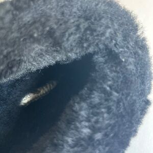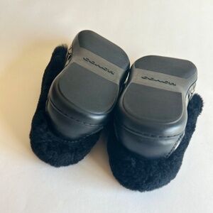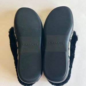 Coach Grey Black Canvas Sheepskin Fur Rubber Outsole Slippers size 7.5. Heel 0.5”, sheepskin fur lining. In great condition, gently worn a few times, a few small scuffing on the right shoe but not visible.