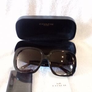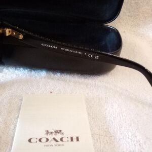 New with tags. The Coach HC8323U C6185 sunglasses feature a bold, oversized square silhouette in a sleek black acetate frame paired with gradient dark grey lenses. Designed for everyday elegance with a touch of attitude, these sunglasses offer full UV protection and lightweight comfort. Signature Coach branding at the temples adds a refined designer detail, making them the perfect blend of luxury and versatility.