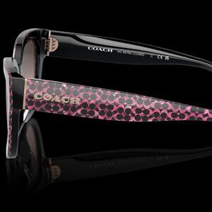 New with tags. The Coach HC8379U sunglasses are a bold and elegant statement piece, featuring a rich Ruby Pearl frame with the iconic Coach Signature C detailing. The oversized square silhouette is paired with stunning grey rose gradient lenses that offer 100% UV protection while adding a soft, feminine edge. Lightweight and fashion-forward, these sunglasses are perfect for anyone looking to elevate their everyday look with a touch of signature style.