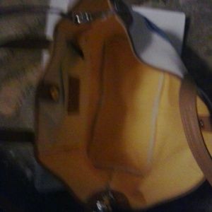 Hadley Blue/ White with Silver Hardware. Yellow interior lining , hand straps and detatchable. Shoulder strap