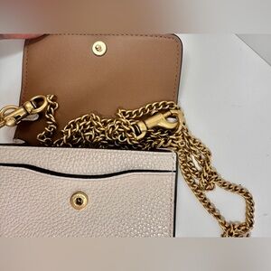 Stylish ivory bag with a gold chain. Features Coach logo detail. Small and compact. Chain strap is detachable and is 23 1/4” drop. Two credit card slots. Snap closure. Clean no scuffs or marks. New no tags. From a smoke free home.